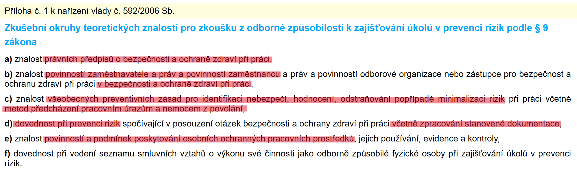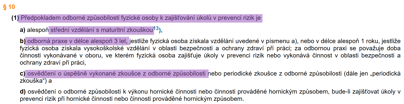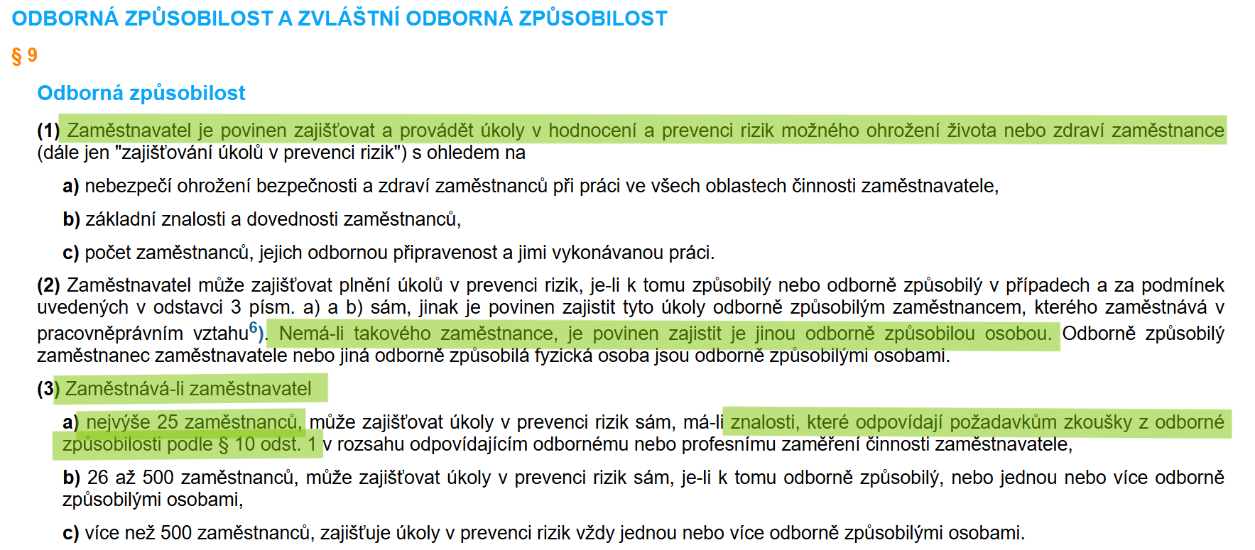 Zaměstnává-li zaměstnavatel … a) nejvýše 25 zaměstnanců, může zajišťovat úkoly v prevenci rizik sám, má-li znalosti, které odpovídají požadavkům zkoušky z odborné způsobilosti podle § 10 odst. 1 v rozsahu odpovídajícím odbornému nebo profesnímu zaměření činnosti zaměstnavatele.
