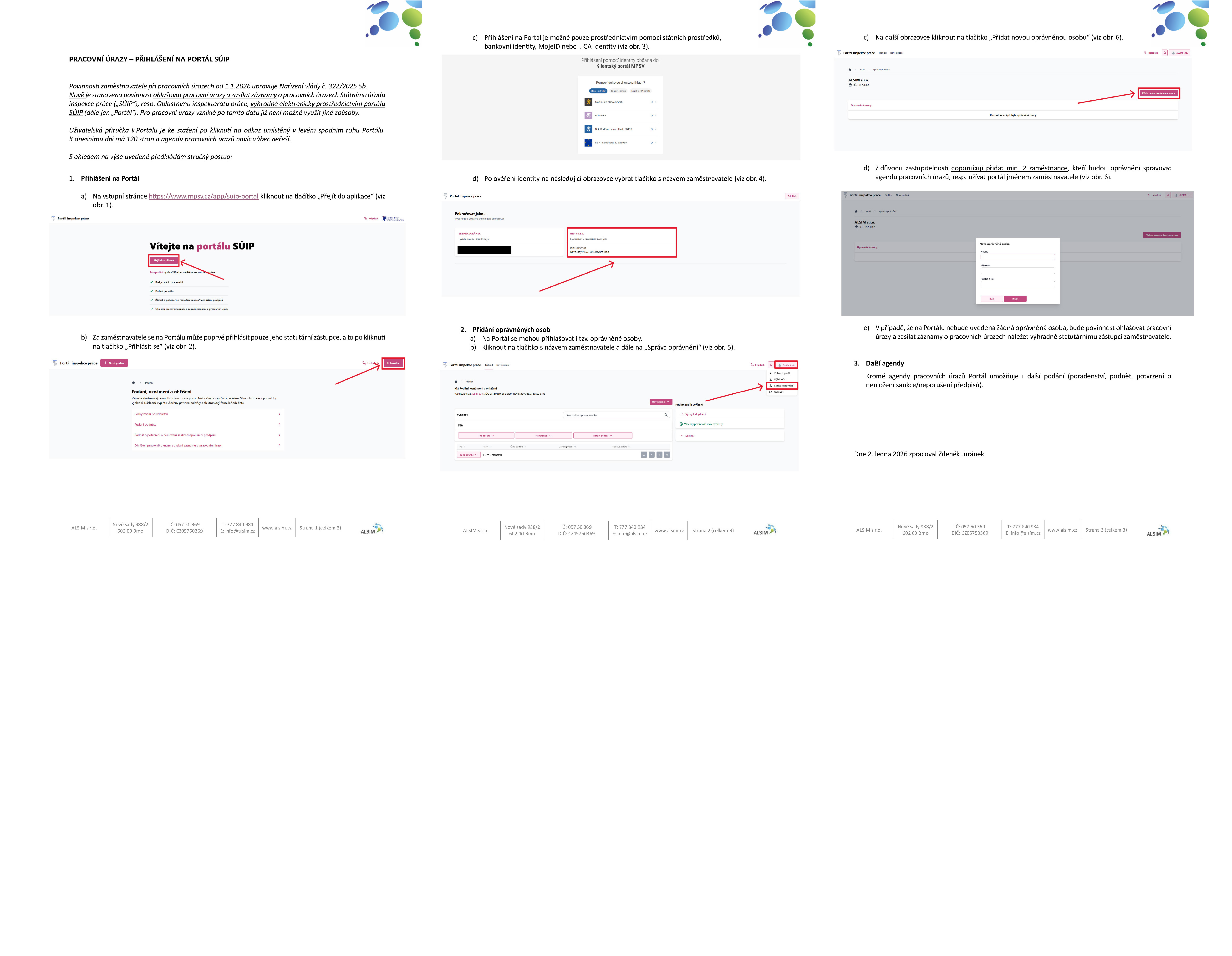Uživatelská příručka k Portálu je ke stažení po kliknutí na odkaz umístěný v levém spodním rohu Portálu. K dnešnímu dni má 120 stran a agendu pracovních úrazů neřeší. První přihlášení na Portál je nutné provést statutárním zástupcem zaměstnavatele. Pouze on má možnost delegovat agendu pracovních úrazů na tzv. „oprávněné osoby“, které mohou spravovat data o pracovních úrazech.